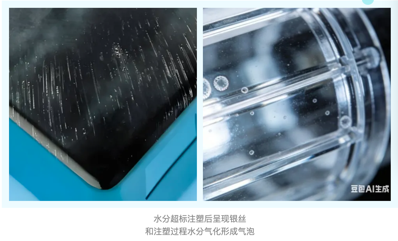 ● 注塑成型:高温下水分瞬间气化,在制品内部形成微气泡,表面形成银纹(银丝),机械强度大幅降低,直接导致产品不合格。